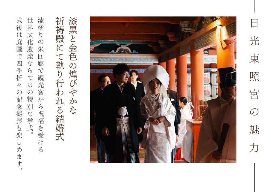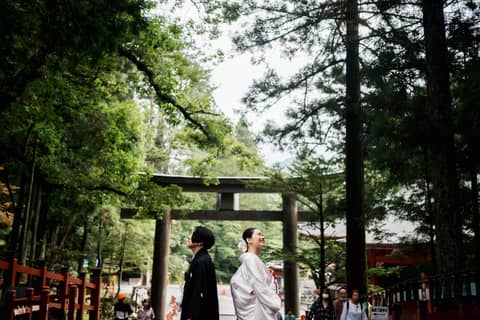陽明門や祈祷殿を背景にした撮影の他、新郎新婦お二人きりの撮影もご案内しております。