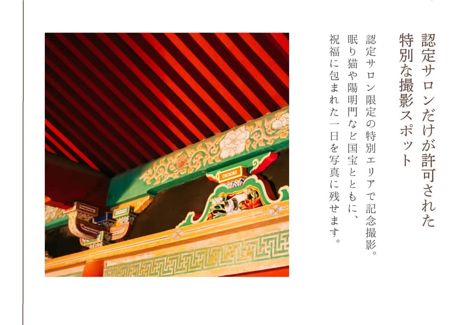 一般の方は立ち入るのことのできない廊下や平和の象徴「眠り猫」など、貴重な場所にて撮影致します。