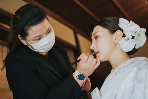 お支度は、挙式の約4時間前から始まります。日光東照宮には着付室のご用意がございませんので、提携の宿泊施設や会食会場にてお着付けやヘアメイクを行っております。