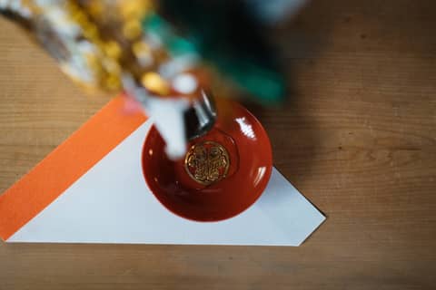 おふたりだけではなくご参列の皆様の盃にも御神酒を注ぎ、神職の発声にて乾杯を行います。使用した盃は懐紙に包み記念品としてお持ち帰りいただけます。