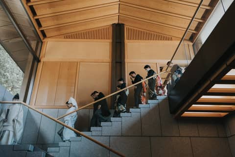 神職による挙式説明の後、参進となります。おふたりを先頭に血縁順に整列いただき、祈祷殿へ向かいます。昇殿する途中に長い階段がございます。ご新郎はご新婦の手を携えてお進みください。